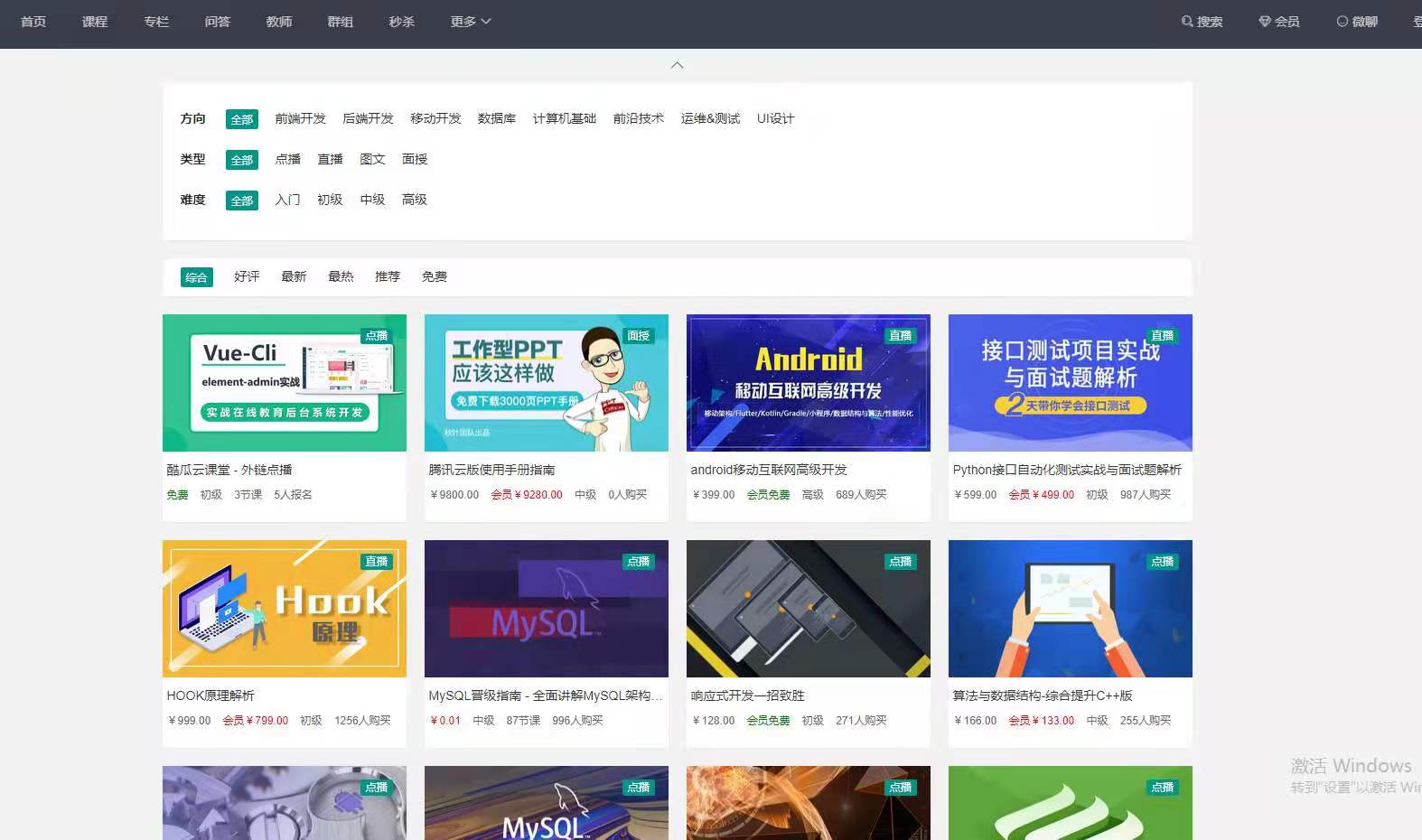 系统功能:实现了点播、直播、专栏、面授、问答、会员、群组、积分、秒杀等,100%真开源在线教育解决方案。
