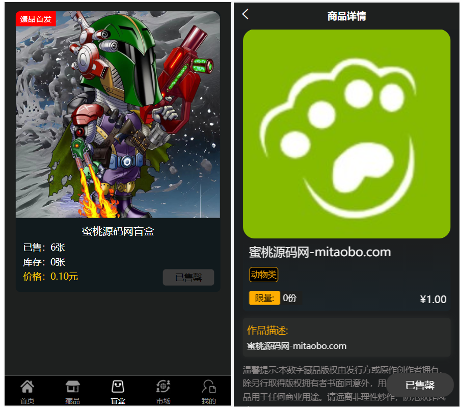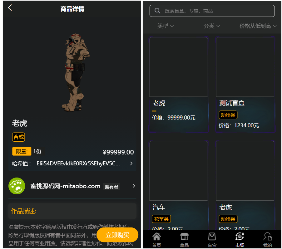 推荐NFT源码数字藏品艺术品交易平台铸造市场转售盲盒商城系统仿鲸探源码admin3年前更新关注私信100 藏品发售购买交易 1.二级市场:用户的藏品可以直接挂售到二级市场商城 2.合成:购买碎片后可以合成对应的艺术品,后台灵活设置 3.营销推广:邀请好友赠送艺术品 nft 数字藏品 数字藏品源码 艺术品交易 蜜桃源码普通 打赏 收藏 海报 链接 THE END精品源码综合分类 点赞0 分享QQ空间微博QQ好友海报分享复制链接收藏