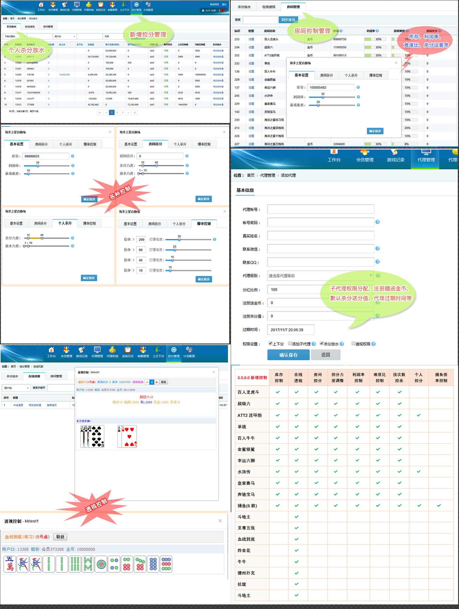 捕鱼类:新增库存控制、房间杀分(修复房间杀分没效果通病)、个人杀分 ,爆率控制,游戏难度比控制、利润率控制