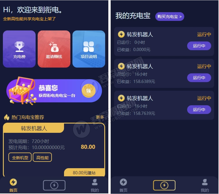 热门街电,共享充电宝,挂机自动赚钱机器人,仿云海广告云点机器人,在云点机器人广告的基础上更新了充电宝UI界面。