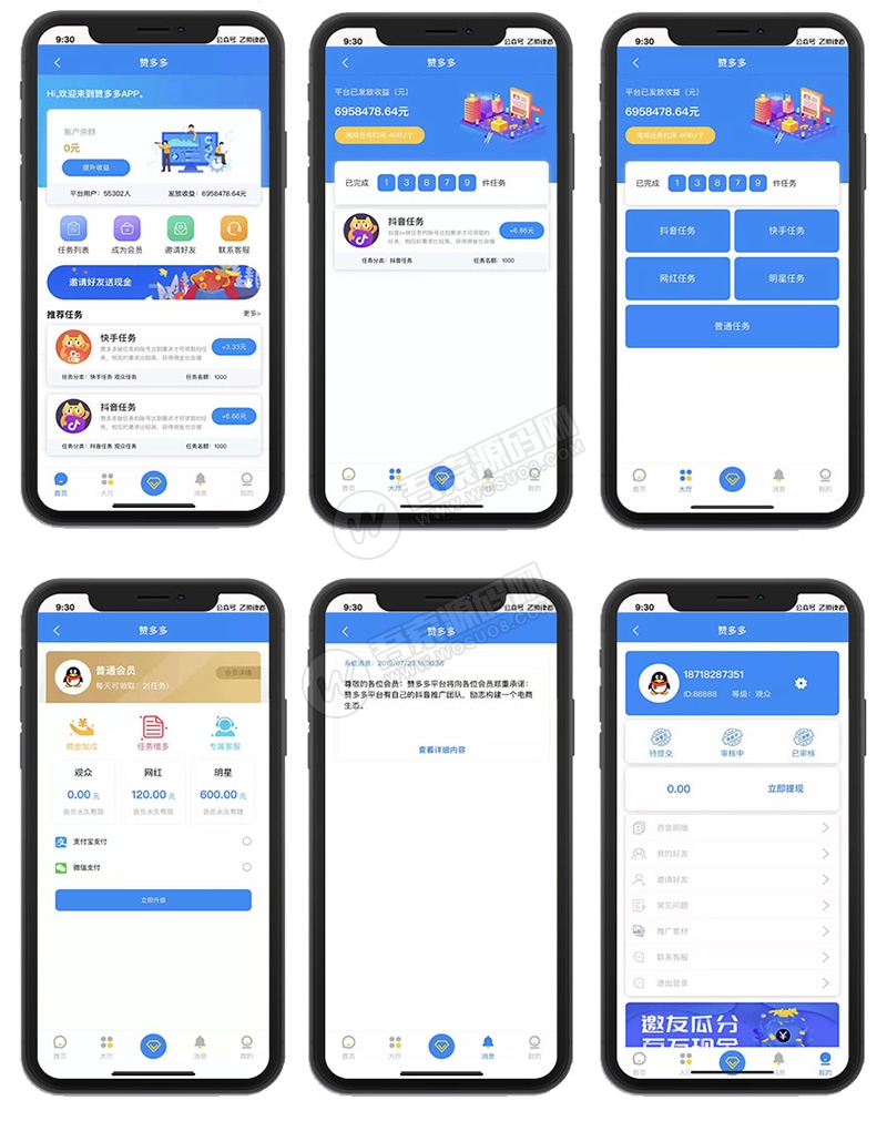 首页任务接单,主要分为抖音和快手任务关注点赞,用户可以领取符合要求的任务,复制任务打开app关注和点赞,截图提交,后台审核通过后即可领取佣金,根据不同的等级每天领取的任务个数和单价都不一样,后台设置,还可以通过海报推广好友,获取推广的返佣,同时还可以领取推广下线的任务返利。