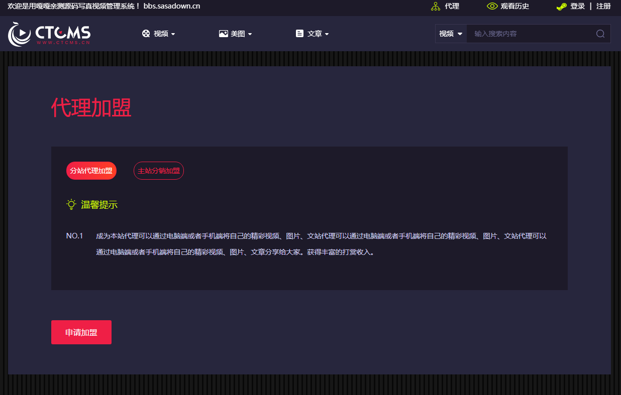 用户上传代理(申请为主站代理之后,用户可以发布 视频 图片 资讯 设置为收费。其他用户消费者的消费金额与发布者进行分成)